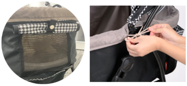 また、側面にあるスナップボタンをつけるとお持ちのカートに一番フィットするサイズに調整でき、カートの中でもたつきません。