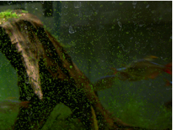 まるでグリーンの入浴剤を入れたかのように、水槽の水が濁ってしまいます。アオミドロと同じく光の量が多すぎるか、購入した水草に付着していることなどが発生の原因です。また、水の富栄養化も大きな原因なので、発生したら消えるまで、毎日水かえをしましょう。